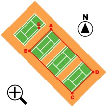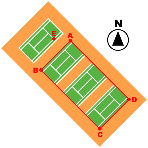 会場となるテニスコートは全部で4面あり、手前の1面を作業スペース、残り3面を競技フィールドとします。 フィールドマップにおいて、点ABCDで囲まれた範囲が競技フィールドで、線ABがスタートラインとなります。 また、E点は既知のスタートポイントとして使用していただけます。